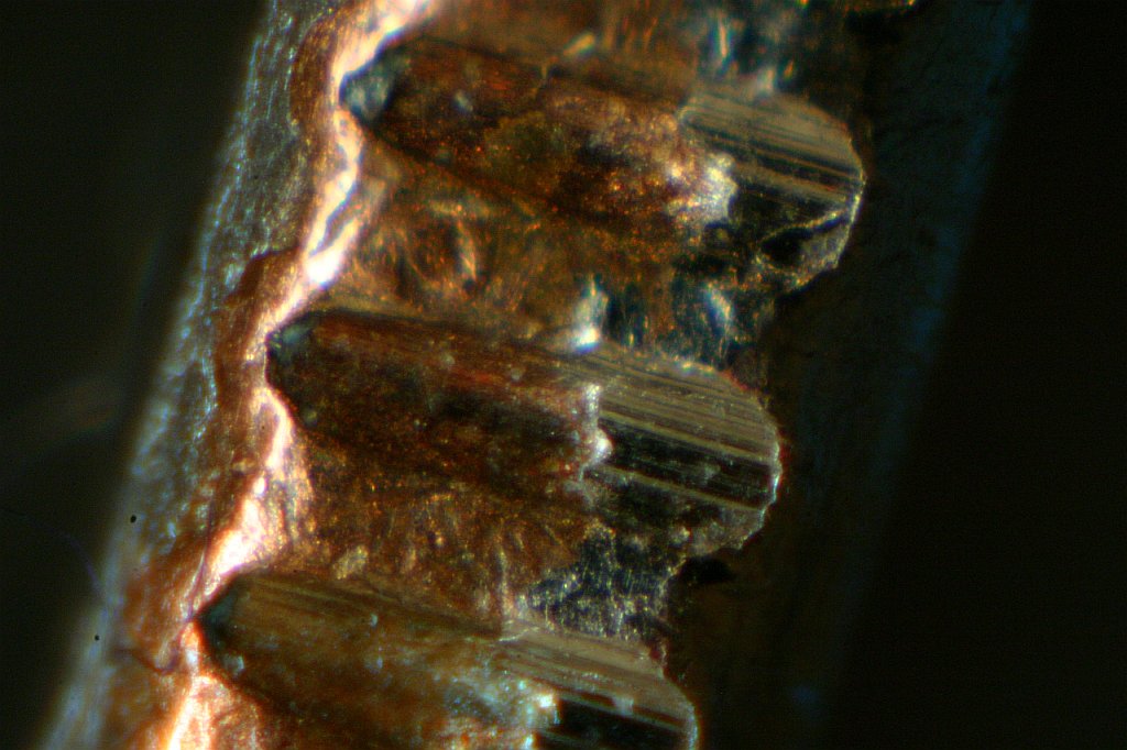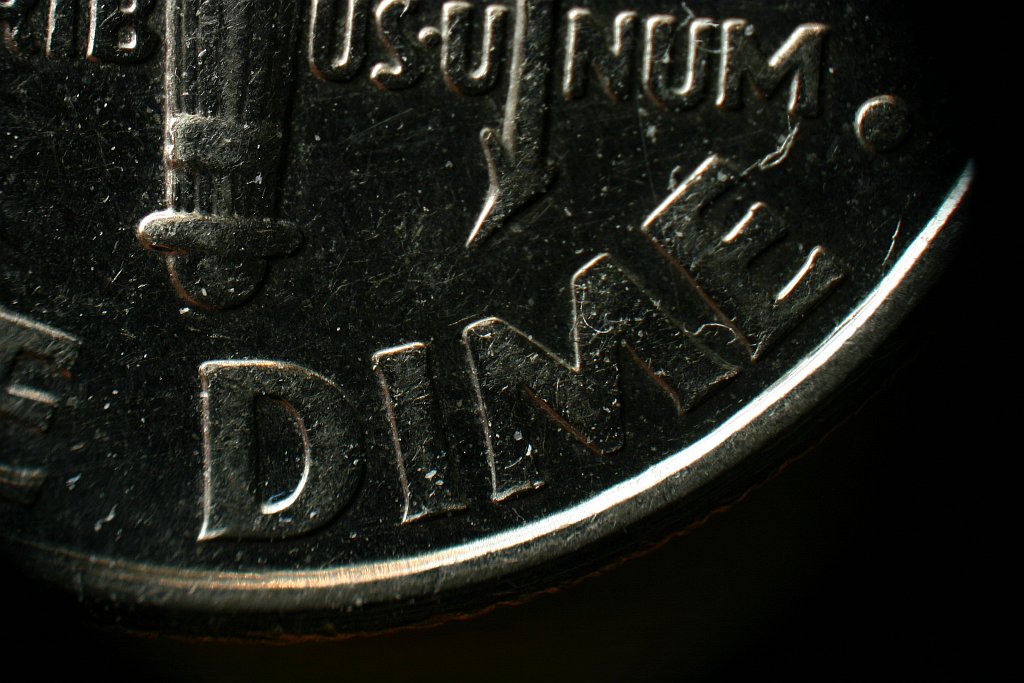 Edge of a dime. Taken with 70-200L at 200mm, and 12-24 inverted at 12mm. Image is uncropped. Roughly 15:1 magnification.