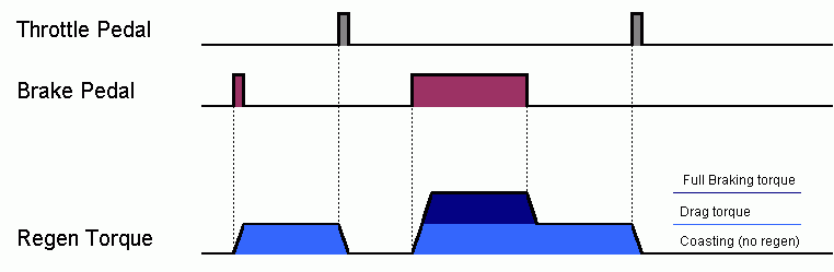![]() I setup a regen braking profile as shown above. If I tap the brake pedal, "drag regen is selected". I can return to coasting mode (no regen) by pressing the gas pedal. If I press and hold the brake pedal, I get full regen braking. When I release the brake, drag regen is selected. When I press the gas pedal, coasting mode (no regen) is selected. This allows me to maintain speeds down hill without having to cycle between coasting and regen braking. Braking torque is set to 25% and Drag torque is set to 10%. |