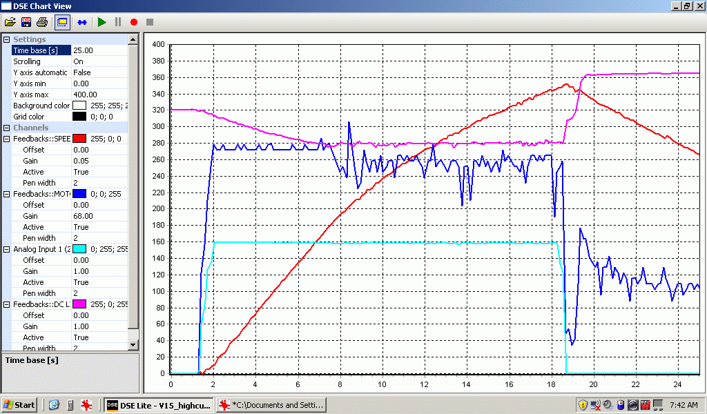 | 2009-05-30 I bought a mini laptop and set it up to acquire data from my inverter. ![]() Here is a graph showing 0-60 in 20 seconds. You can see the red line (motor speed) changing as I shift though 1st, 2nd, and 3rd gear Torque limit is set to 125%. Current limit is set to 230A. DC Bus Voltage (0-400 VDC) Motor RPM x 20 (0-8000 RPM) Motor current (0-400 Amps/Phase) Throttle position (0-125% torque demand) 60mph = 6800 rpm in 2nd, 4400 in 3rd, 3300 in 4th. |