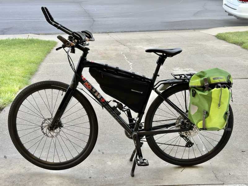 About my touring bikeMy bike is a 2020 Specialized Sirrus X 3.0It's considered a commuter hybrid bike, the handle bars are higher than the seat, so it has a comfortable upright position for all day riding. Riding in a forward race position (seat above handle bars) with your neck bent back is not great for touring, nor is it great for being able to look around as you ride.My bike as it came from the store new weighed 25.7 lbs. Adding a kickstand (1.36lbs), Rack (1.28lbs), Fender (.22lbs), Aerobars (1.23lbs) Blackburn triangle bag (0.8lbs) GPS, gopro and Garmin mounts; bells, lights, grips, tire sealant, larger cassette... It now weighs 33.5 lbs as ridden, around 58 lbs with rear panniers, tools, spare tube and bike lock. It sells new for around $800. I also have the carbon fiber version of this bike which weighs 20 lbs, but it doesn't have a mount for a kickstand, which is essential for loading panniers; it's also more fragile with lightweight skinny wheels and tires. ![]() |