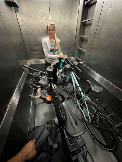 Aug 4, 2023Checked into our hotel (Frankfurt Sheraton) across the street from the airport; dropped off the bags we were carrying, and headed back to the airport to fetch our bike boxes. It took us 45 mins to cross the street to the hotel with the bike boxes, mainly due to having long queues at the elevators. Some elevators were too small, so we had to do multiple trips, and stack the boxes. We had to go backwards though customs to access one of the elevators; wheel chair access is not like it is in the US. We assembled our bikes in the hotel corridor, this took about 1h15m. When I booked the hotel, I asked about bringing the bikes to the room; they said no problem. They saw we had a reservation 3 weeks out and said we could keep our bike boxes in their storage room until our return! We were able to fit one box inside the other so we didn't take up too much space. Went to the train station, printed our tickets for the following morning, grabbed some quick food, and off to bed! |