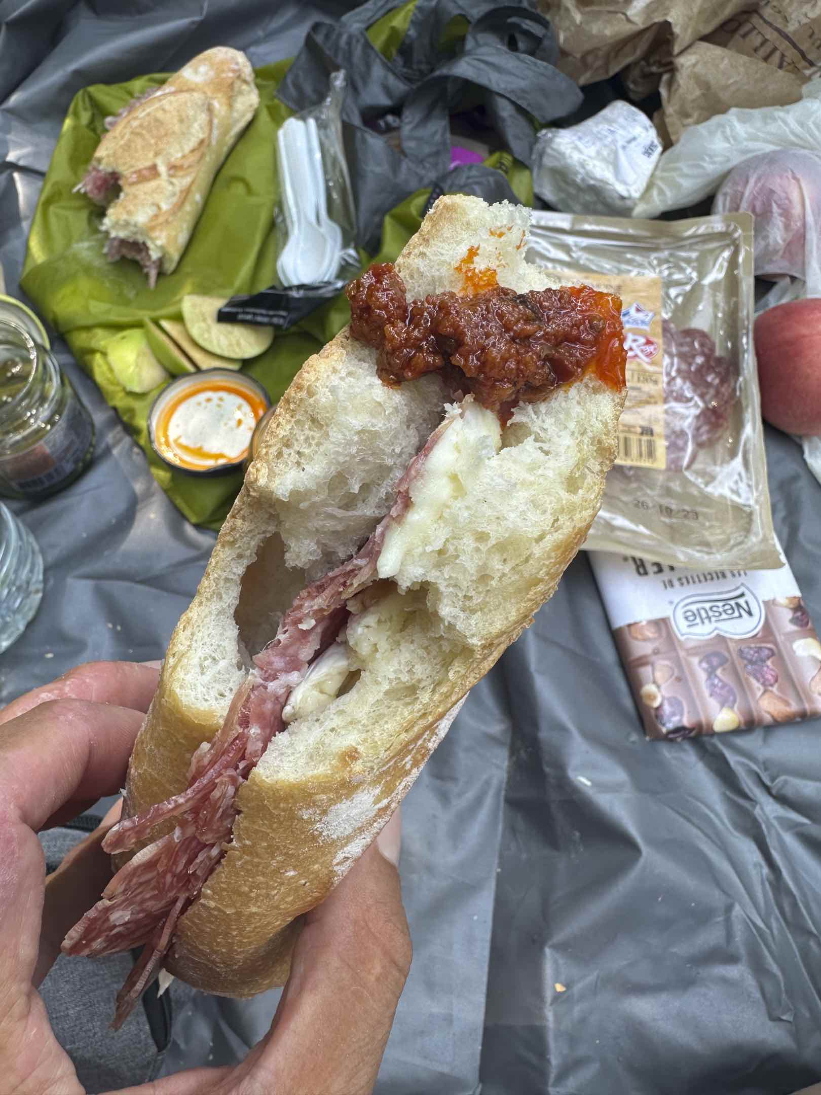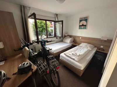 Aug 16, 2023 - 44.2 milesDay 12 - Strasbourg to Steinmauern (half way to Heidelberg). 44.2 miles, 165’ climb. Today was just about getting miles in. The French side of the river was pretty boring, mostly country side without shops, restaurants, water fountains… Really glad we bought lunch stuff and a huge bottle of water before we left.Around 4pm we decided to get on a cable drawn barge and cross into Germany. At the (German side) dock was a snack shack with ice cream, hot food, sodas; and a hotel, we decided to hang out for an hour and let the heat die down. Biking mid day was quite warm, 85+ deg. We’re staying on the German side from now on! We rented a room in a Pension from a lady at a Pizza place in the middle of no where. All the credit card machines and ATMs were down, so had to bike a couple blocks to find a working ATM. No AC in the room we’re renting, but it has a nice bathroom and a fan and it’s cooling down nicely tonight, $85 Euros. Bakery across the street, we're good to go! |