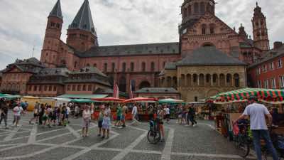Aug 19, 2023 - 27.68 milesDay 15 - Mainz to Rudesheim am Rhein - 27.68 miles, 269 feet climb. Didn’t start biking till noon, just enjoying watching people drink wine while we ate breakfast and had coffee in Mainz. It’s a beautiful town with lots of public spaces for having coffee or drinking wine. Seems to be a college town, with groups of guys dressed in matching shirts drinking wine together in socks and sandals.McDonalds seems to be the only place (with AC) to get a cold drink with lots of ice, and they still have the deep fried apple pies here, like we had at home when we were kids in the 80’s. To cross the Rhine where we are, we had to take a ferry. We arrived at Rudeshem am Rhein around 4:30pm, which is really early for us. There’s a huge festival going on, and the first 6 hotels we checked were fully booked. Luckily we got the last room, and it has AC, and it’s right in the heart of the festival. The AC is a portable unit with a hose, I pulled some shelves off the bookshelf in our room and used them to seal the AC hose around the window. The town is another beautiful German town with lots of historic buildings and restaurants. |