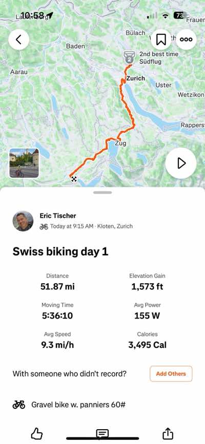| Aug 24, 2025 We biked from the Zurich Airport to Lucerne today. We rode through the new bike tunnels at the Zurich HBF, and checked out the water front area. About halfway through the ride, we stopped for a picnic lunch, and checked out Cham and it's lake. We reached Lucerne around 5:30pm, and checked into our hotel (Hotel Baslertor). Our room had a big patio area overlooking the pool (unheated). We spent the rest of the evening exploring Lucerne by bike. |