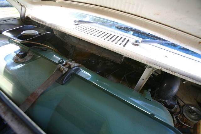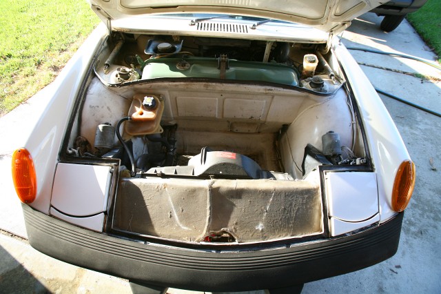 here is the battery tray area, a common problem area on 914s. The tray was removed to make room for the air filter. The sheet metal is rusted, but the frame underneath is fine.