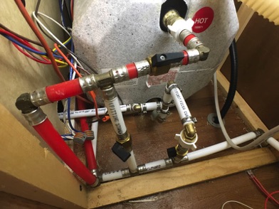 We finally have a full 80x60 queen bed, large fridge/freezer, and A/C. Only thing we miss is having an oven. The white cabinets make the decor feel more modern and bright compared to trailers with wood paneling. The red accents also really liven up the interior.